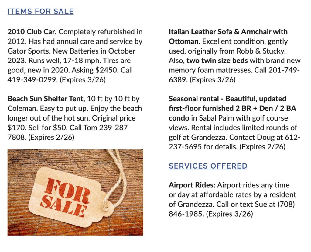 To place a classified ad Grandezza residents may e-mail [email protected]. An ad will run for THREE (3) MONTHS beginning with the first submission. Please inform us when the item has been sold or if you wish to have it deleted from the column. Also, you must notify us to continue an ad for an additional cycle after the initial 3-month period has expired or it automatically will be deleted. (Ending cycle of the ad running is noted at the end in parentheses.)