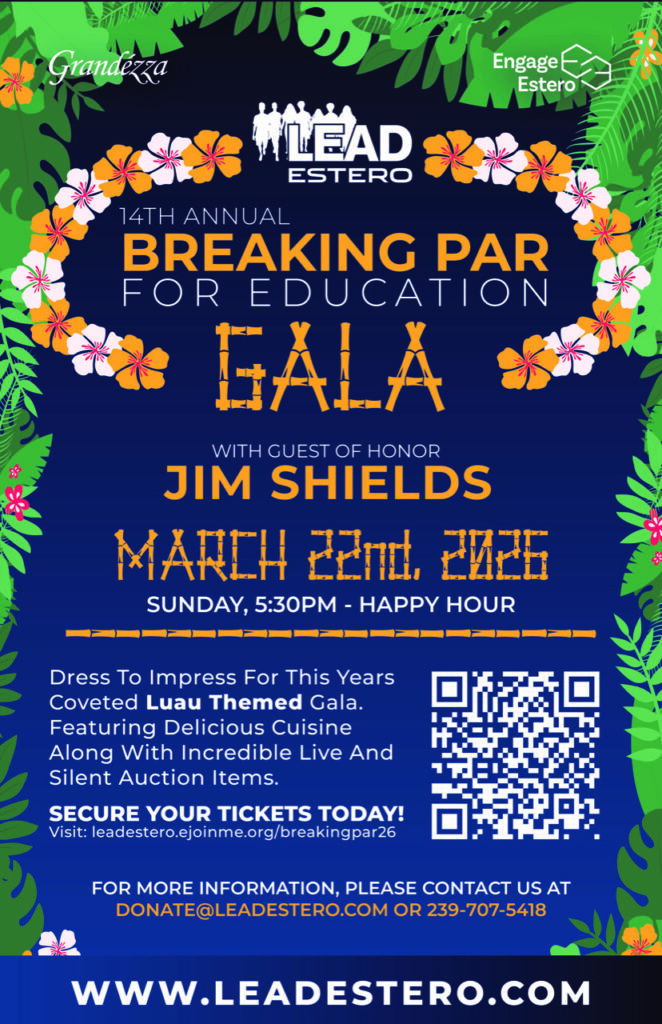 Come enjoy the Luau Theme Gala at Grandezza on Sunday, March 22 and support Estero Education. You won’t want to miss the fun, delicious cuisine and the incredible live and silent auction items at this 14th Annual Breaking Par Gala. Happy Hour starts at 5:30 p.m. The students of LEAD Estero will provide a tropical paradise that is sure to please.