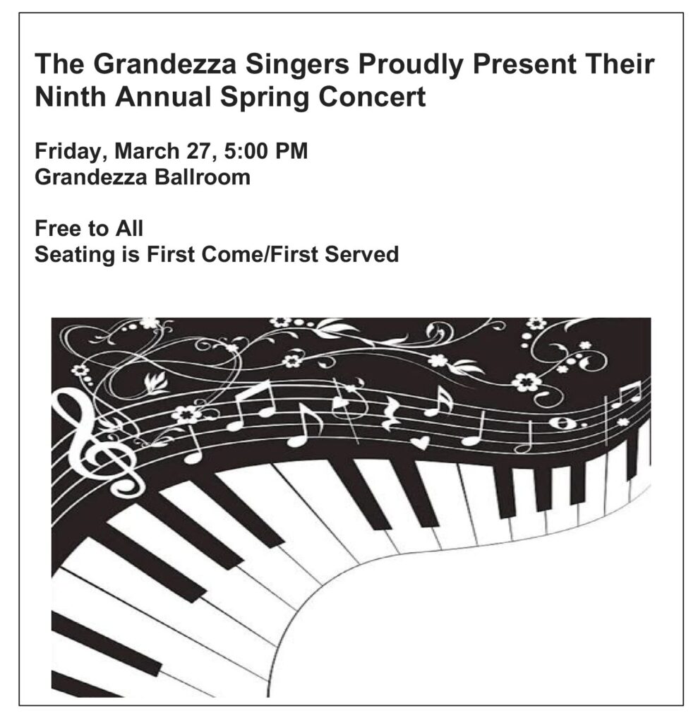 Music and community will come together when The Grandezza Singers present their Ninth Annual Spring Concert on March 27 at 5 p.m. in the Grand Dining Room. Composed of friends and neighbors from within Grandezza, the group is excited to share an evening of familiar, feel-good songs that are sure to have toes tapping and smiles all around.